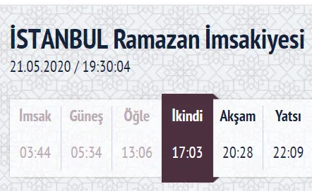 Bugün İstanbul iftar saati için sayılı dakikalar kaldı. İstanbul iftar saati ne zaman? İslam alemi, On Bir Ayın Sultanı ve aynı zamanda mübarek üç ayların sonuncusu olan Ramazan ayına veda edecek. Corona virüsü nedeniyle iftar ve sahurlar kalabalık ortamlardan ve sevdiklerimizden uzakta geçti. Her Ramazan olduğu gibi bu Ramazan da en çok araştırılan konular arsında İstanbul iftar saati ve namaz vakitleri yer alıyor. Kızılelma’nın anahtarı olan bu şehirde yaşayan milyonlarca Müslüman İstanbul iftar vakitleri ile ‘İstanbul’da iftar saat kaçta?’ sorusunun yanıtını araştırıyor. İstanbul İmsakiye ve ezan saatleri, Diyanet İşleri Başkanlığı tarafından yayımlandı. Haberimizde, 2020 İstanbul imsakiyesi, iftar saati ve ezan vakitleri yer almaktadır. İşte, İstanbul iftar saati 21 Mayıs Perşembe ve Ramazan ayı boyunca İstanbul imsakiyesi…