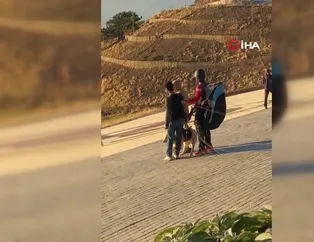 Köpeğiyle yamaç paraşütü atlayışı yaptı, o anlar kamerada