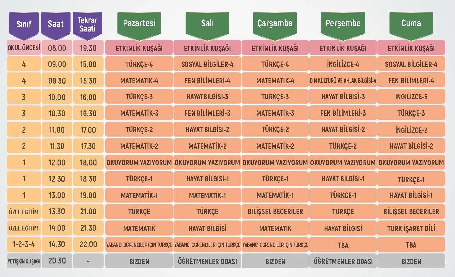 EBA İLKOKUL DERS PROGRAMI YAYIN SAATLERİ 23 KASIM - 27 KASIM