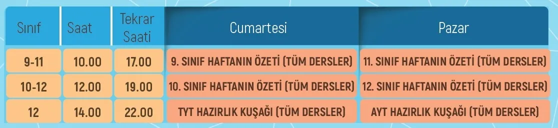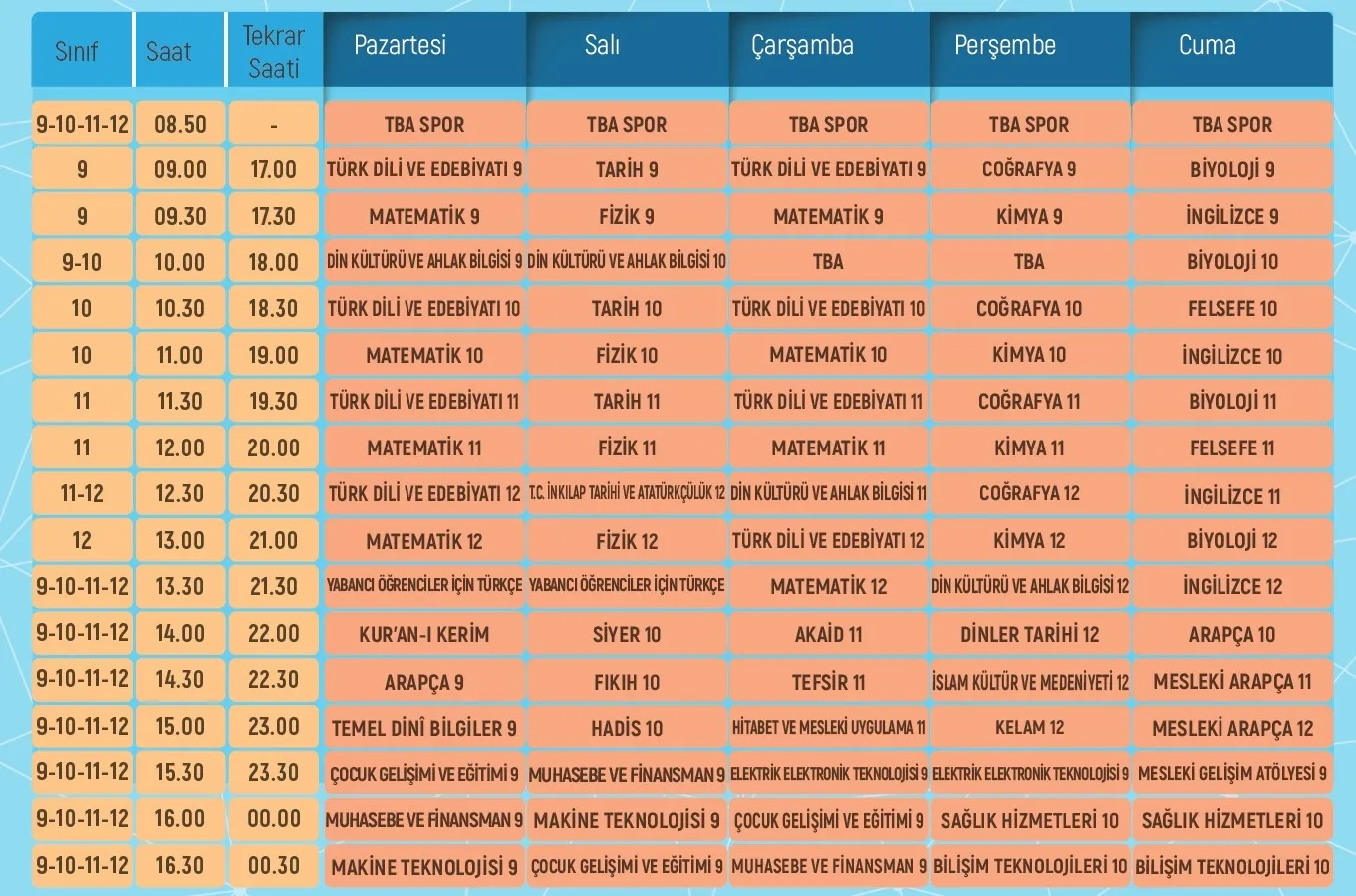 EBA TV LİSE DERS PROGRAMI YAYIN SAATLERİ 30 KASIM - 6 ARALIK 2020