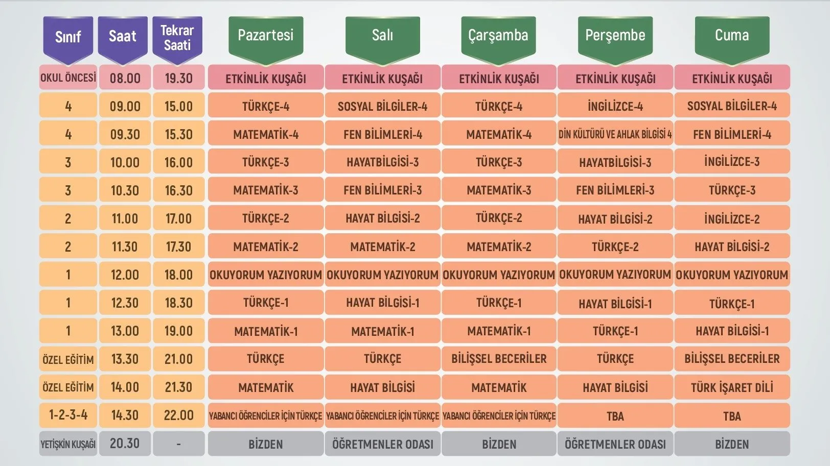 EBA İLKOKUL DERS PROGRAMI YAYIN SAATLERİ 19 EKİM - 23 EKİM