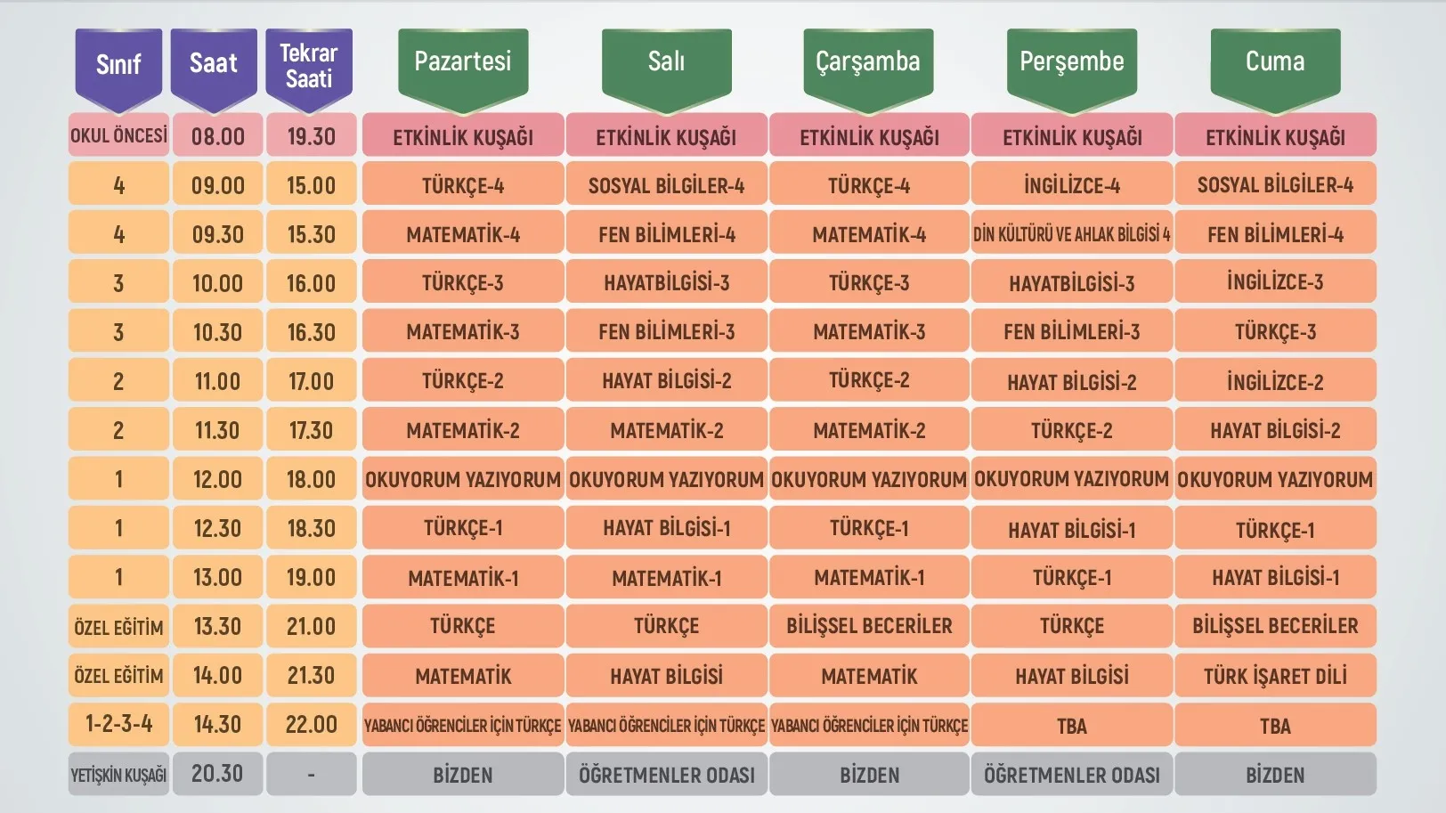 EBA İLKOKUL DERS PROGRAMI YAYIN SAATLERİ 19 EKİM - 23 EKİM