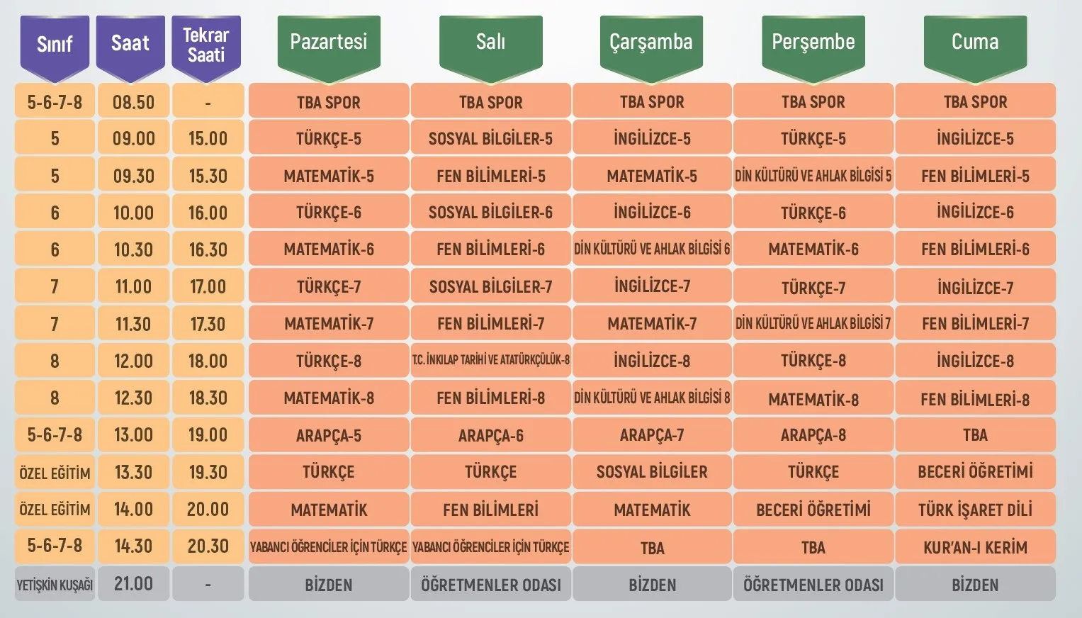 ORTAOKUL DERS PROGRAMI YAYIN SAATLERİ EBA TV 12 EKİM 2020 - 16 EKİM 2020