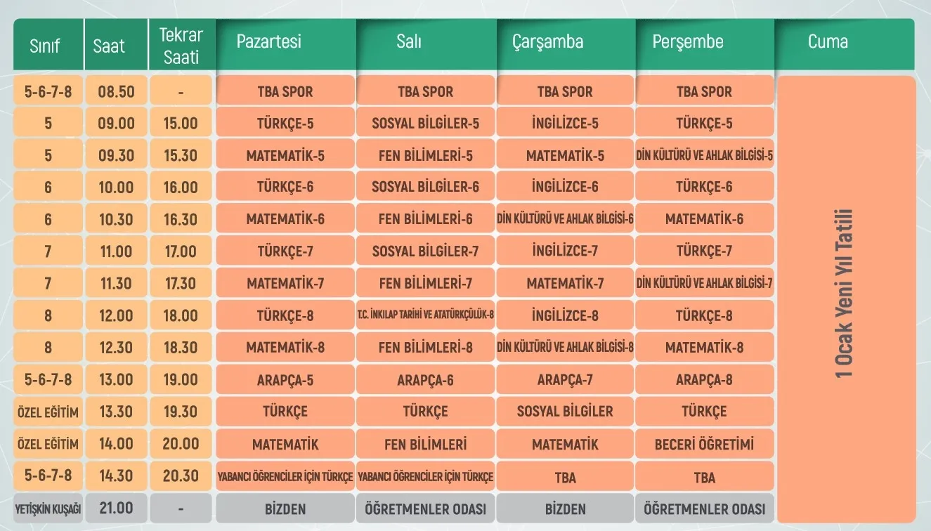ORTAOKUL DERS PROGRAMI YAYIN SAATLERİ EBA TV 28 ARALIK 2020 - 3 OCAK 2021