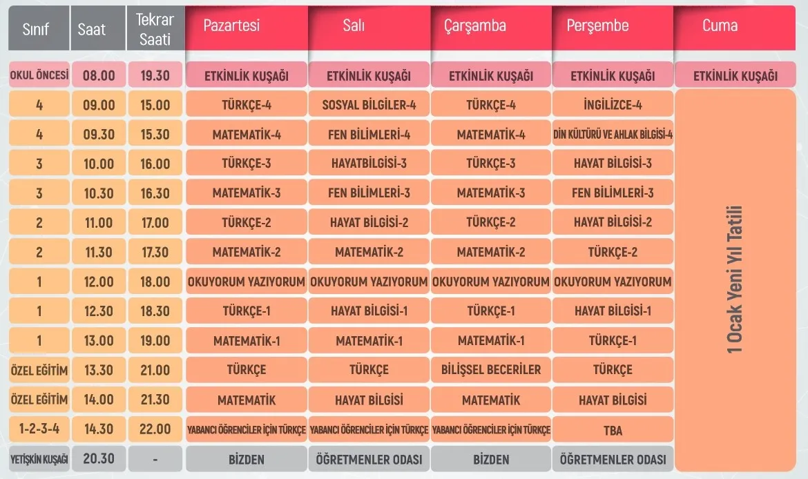 İLKOKUL DERS PROGRAMI YAYIN SAATLERİ EBA TV 28 ARALIK 2020 - 3 OCAK 2021
