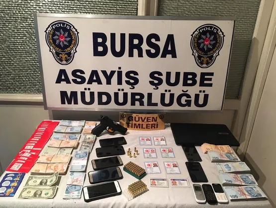 İkamette yapılan aramalarda 12 cep telefonu, 29 SIM kart, 6 sahte nüfus cüzdanı, 2 sahte surücü belgesi, laptop, banka kartları, ziynet eşyaları, ruhsatsız tabanca, 2 adet "F" serili 1 dolar ve şüphelilerin bu işten elde ettiği paralar ele geçirildi.