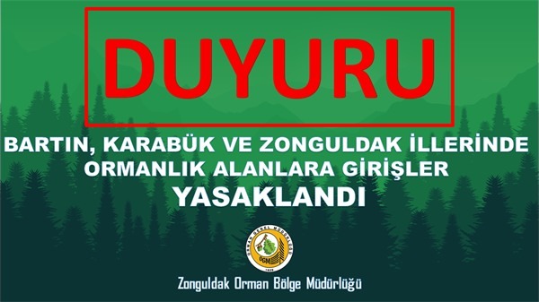 Bartın, Karabük ve Zonguldak illeri Orman Yangınlarıyla Mücadele Komisyonlarının aldıkları kararlar gereğince, Bartın ilimizde 31.10.2022, Karabük ilimizde 01.10.2022 ve Zonguldak ilimizde ise 30.08.2022 tarihine kadar orman parkları haricinde ormanlara giriş ve çıkışlar yasaklandı.