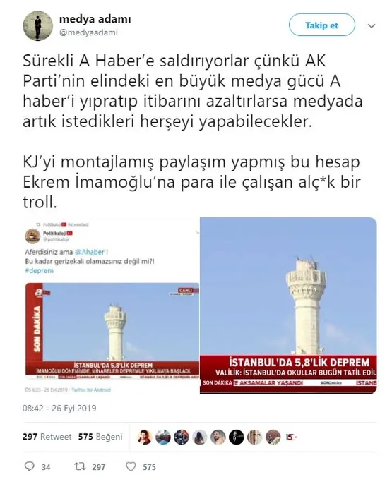 İstanbul bugün 5.8'lik bir depremle sarsıldı. Can kaybının yaşanmadığı depremin ardından bazı provokatiflerse boş durmadı. Sosyal medyadan algı operasyonu yaparak A Haber'i hedef aldı. Montajlanan bir görselle algı yaratmaya çalışan provokatifler istediklerini elde edemedi. İşte sosyal medyada yapılan o çirkin saldırı: