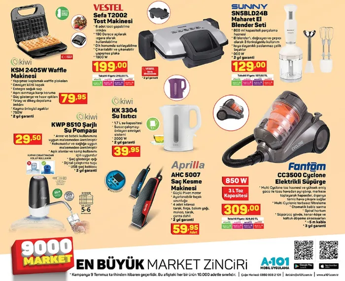 Yeni haftanın merakla beklenilen A101 aktüel ürünler kataloğu kurumun resmi sitesi üzerinden yayımlandı. Her hafta olduğu gibi bu hafta da pek çok üründe pek çok indirim olacak. Sunny Blender Seti, Fantom elektrikli süpürge, su ısıtıcısı gibi pek çok ürün Perşembe günü raflarda yerini alacak. Peki; A101'de bu hafta neler var? İşte A101 9 Temmuz 2020 ürünler listesi!