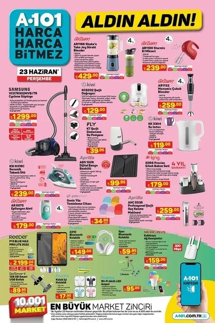 Bu hafta A101 aktüel ürünler kataloğunda yine birbirinden dev indirimler müşterileri bekliyor olacak. Bu hafta özellikle televizyonlardan, beyaz eşyaya, küçük ev aletlerinden, cep telefonlarına, araç bakım temizlik ürünlerinden, bahçe bakım ve boya ürünlerindeki dev fırsatlar dikkatleri üzerine çekiyor. Dar gelirliden yüksek gelirliye her cebe hitap eden indirimler kurumun resmi sitesi üzerinden "Aldın Aldın" başlığı altında yayınlanan katalogla duyurulmuştu. Bu kapsamda "23 Haziran 2022 A101 aktüel ürünler kataloğunda bu hafta neler var?" gibi sorular yanıt arıyor. İşte A101 aktüel ürünler kataloğu…