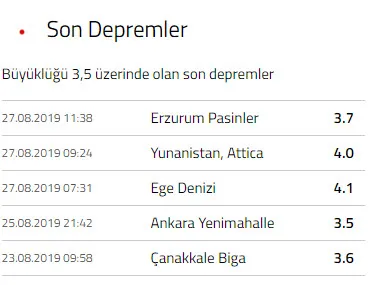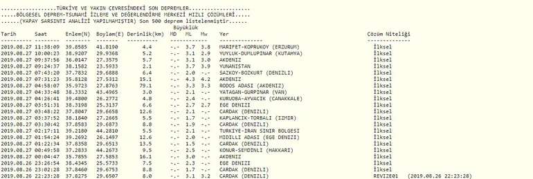 Kandilli Rasathanesi tarafından açıklanan son depremler listesi şu şekilde;
