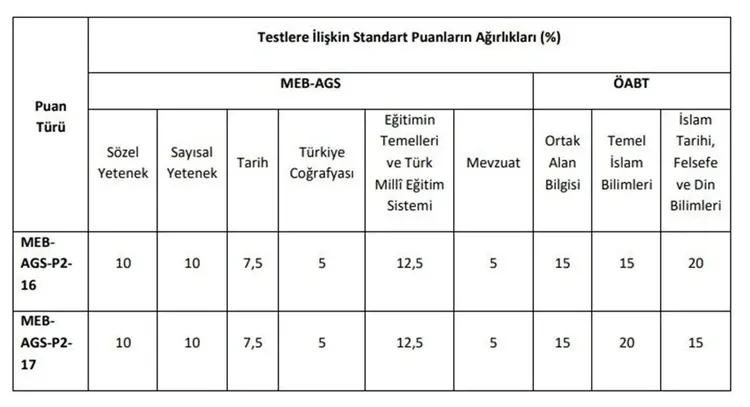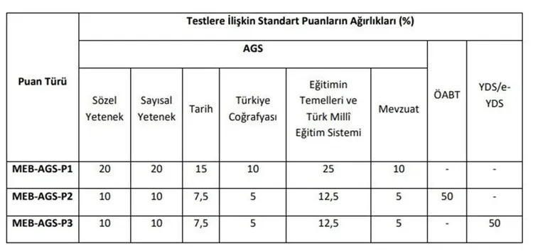 Her test/alt test için hesaplanan standart puanlar aşağıdaki tabloda yer alan ağırlıklandırma oranları dikkate alınarak toplanacak ve Ağırlıklı Puanlar bulunacak.
