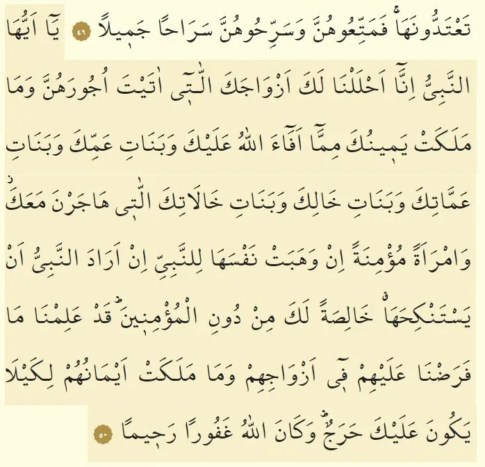 Yâ eyyuhâ-nnebiyyu innâ ahlelnâ leke ezvâceke-llâtî âteyte ucûrahunne vemâ meleket yemînuke mimmâ efâa(A)llâhu 'aleyke vebenâti 'ammike vebenâti 'ammâtike vebenâti ḣâlike vebenâti ḣâlâtike-llâtî hâcerne me'ake vemraeten mu/mineten in vehebet nefsehâ linnebiyyi in erâde-nnebiyyu en yestenkihahâ ḣâlisaten leke min dûni-lmu/minîn(e)(k) kad 'alimnâ mâ feradnâ 'aleyhim fî ezvâcihim vemâ meleket eymânuhum likeylâ yekûne 'aleyke harac(un)(k) vekâna(A)llâhu ġafûran rahîmâ(n).