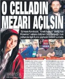 İstanbul'da 13 yıl önce öldürülen 17 yaşındaki Münevver Karabulut'un babası Süreyya Karabulut'un, SABAH'ta manşet olan "O celladın mezarı açılsın" sözleri ses getirdi. Avukat Rezan Epözdemir, ailenin talebi doğrultusunda cezaevinde intihar eden katil zanlısı Cem Garipoğlu'nun mezarını açtıracabileceklerini söyledi. Cem Garipoğlu'nun 3 Mart 2009'da vahşice öldürdüğü Münevver Karabulut'un babası Süreyya Karabulut'un önceki gün SABAH'ta manşet olan talebi gündeme bomba gibi düştü.