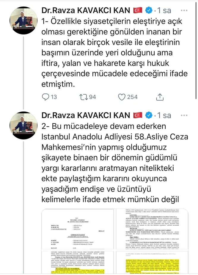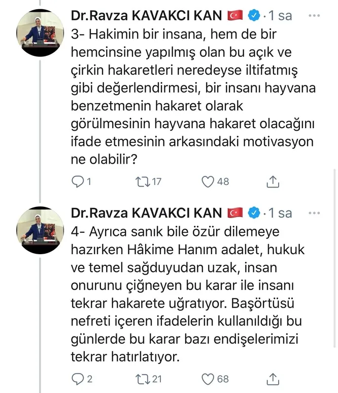 Dr. Ravza Kavakcı Kan, sözlerine şu şekilde devam etti: "Ayrıca sanık bile özür dilemeye hazırken Hâkime Hanım adalet, hukuk ve temel sağduyudan uzak, insan onurunu çiğneyen bu karar ile insanı tekrar hakarete uğratıyor. Başörtüsü nefreti içeren ifadelerin kullanıldığı bu günlerde bu karar bazı endişelerimizi tekrar hatırlatıyor. Yapılan hakaretin içeriğini ayrıca yazarak değil, mahkeme kararındaki kısmının görüntüsünü üzülerek ekte tekrar paylaşıyorum. Bu karara karşı her türlü hukuki mücadeleye avukatlarımla birlikte sonuna kadar devam edeceğimizi tekraren kamuoyu ile paylaşmak isterim."