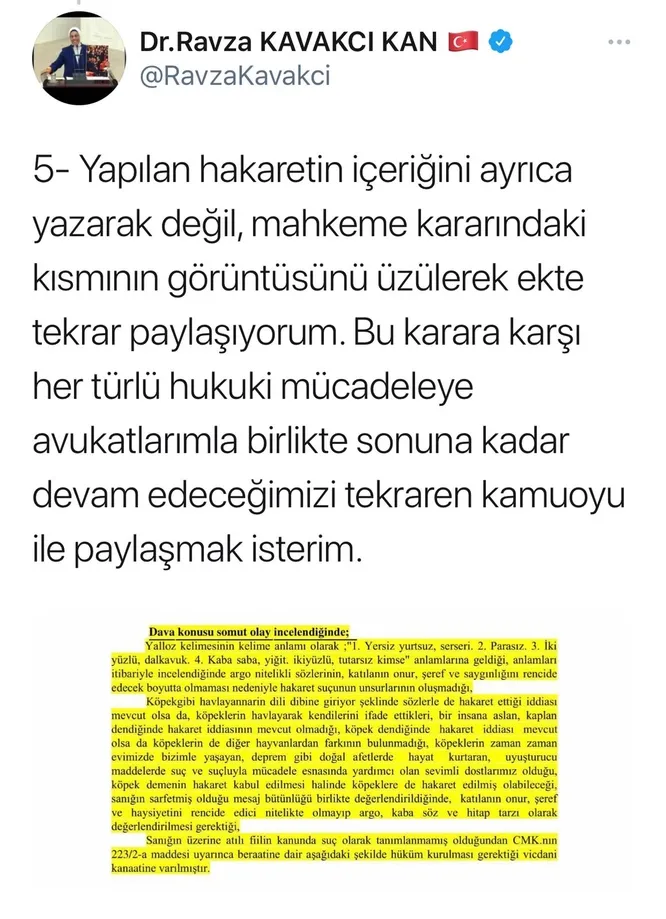 Ancak İstanbul Anadolu Adliyesi 58 Asliye Ceza Mahkemesi hakaret davasındaki değerlendirmesinde "köpek", "y…" gibi ifadelerin hakaret içermediği, hatta "köpek" demenin hakaret olmadığını "kaplan" ile "köpek" ifadelerinin benzerlik gösterdiği gibi bir değerlendirme de bulundu. AK Parti İstanbul Milletvekili Dr. Ravza Kavakcı Kan, bu değerlendirmeyi gördükten sonra sosyal medyadan tepki gösterdi.