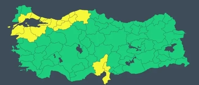 Meteoroloji Genel Müdürlüğü'nden yapılan açıklamada, Adana, Balıkesir, Bolu, Bursa, Çanakkale, Hatay, İstanbul, Kastamonu, Kocaeli, Sakarya, Tekirdağ, Zonguldak, Bartın, Yalova, Karabük, Osmaniye ve Düzce için sarı kodlu gök gürültülü sağanak yağış uyarısında bulunuldu.