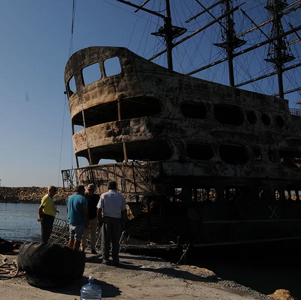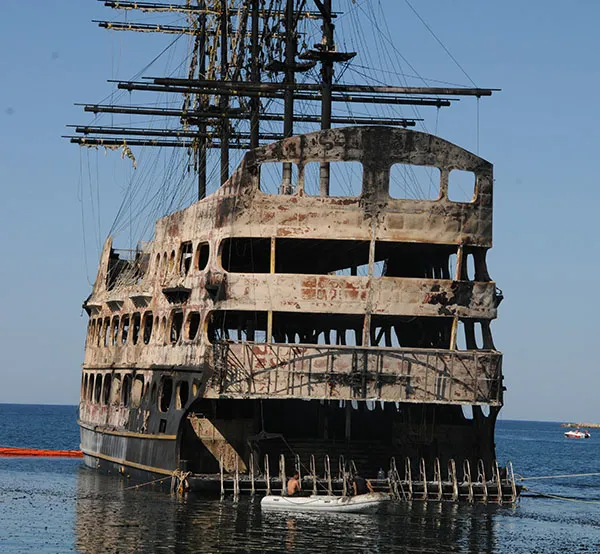 Dünyanın kendi kategorisinde en büyüğü olan 60 metre boy 14 metre genişlik ve 1000 yolcu kapasitesine sahip turizm amaçlı korsan teknesi The Last King, Türklerdeki yat limanında yanarak kül oldu.