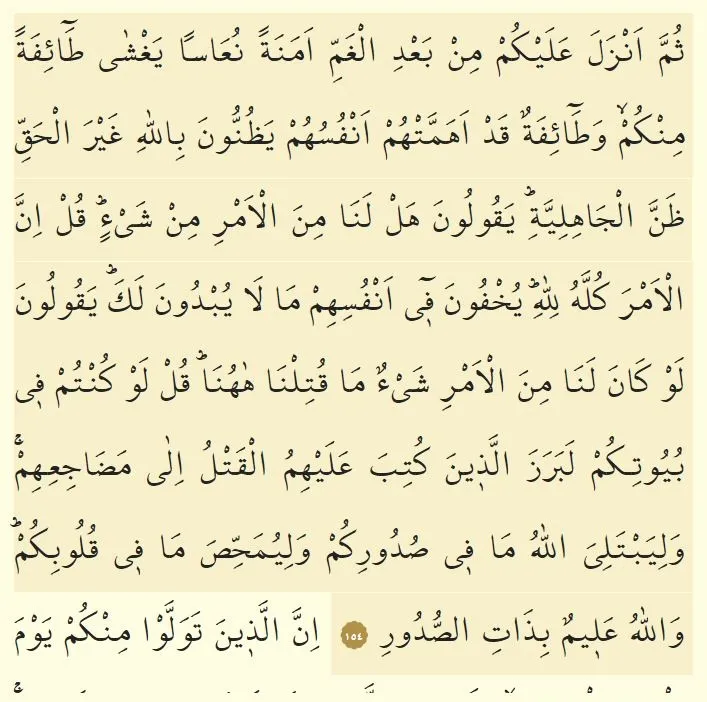 Summe enzele aleykum min ba'dil gammi emeneten nuâsen yagşâ tâifeten minkum, ve tâifetun kad ehemmethum enfusuhum yezunnûne billâhi gayral hakkı zannel câhiliyyeh(câhiliyyeti), yekûlûne hel lenâ minel emri min şey'(şey'in), kul innel emre kullehu lillâh(lillâhi), yuhfûne fî enfusihim mâ lâ yubdûne lek(leke), yekûlûne lev kâne lenâ minel emri şey'un mâ kutilnâ hâhunâ, kul lev kuntum fî buyûtikum le berezellezîne kutibe aleyhimul katlu ilâ medâciihim, ve li yebteliyallâhu mâ fî sudûrikum ve li yumahhısa mâ fî kulûbikum, vallâhu alîmun bi zâtis sudûr(sudûri).