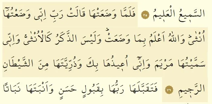 ''Onu doğurunca, "Rabbim!" dedi, "Onu kız doğurdum." -Oysa Allah, onun ne doğurduğunu daha iyi bilir- "Erkek, kız gibi değildir. Ona Meryem adını verdim. Onu ve soyunu kovulmuş şeytandan senin korumana bırakıyorum.''