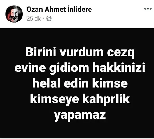 Aydın'ın Efeler ilçesine bağlı Emirdoğan Mahallesi'nde yaşayan Ozan Ahmet İnlidere (31), önceki gün dedesinden miras kalan arazi anlaşmazlığı nedeniyle amcası Mehmet İnlidere (51) ile tartıştı. Tartışma vatandaşların araya girmesiyle kavgaya dönüşmeden önlendi. Ancak sinirlerine hakim olamayan Ozan Ahmet İnlidere, evine gidip pompalı tüfeğini aldı. Kahvehaneye dönen Ozan Ahmet İnlidere, amcasına kurşun yağdırdı. Ağır yaralanan Mehmet İnlidere, İnlidere, hastanede öldü. Olayın ardından kaçan ve sosyal medya hesabından "Birini vurdum cezaevine gidiyorum. Hakkınızı helal edin, kimse kimseye kahpelik edemez" şeklindeki paylaşımla işlediği cinayeti duyuran Ozan Ahmet İnlidere, gözaltına alındı. Olayla ilgili soruşturma sürüyor.