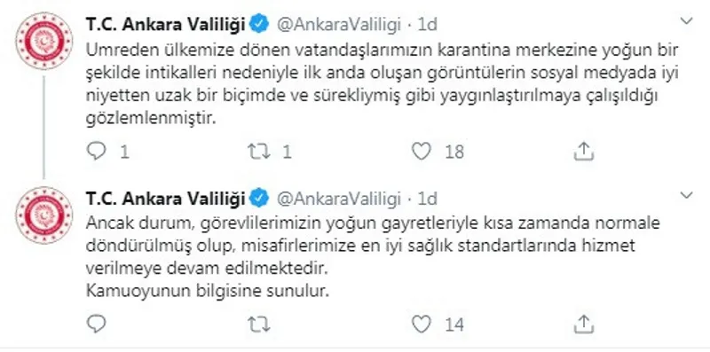 Ankara Valiliği, umreden dönen ve Gölbaşı'ndaki yurtta gözlem altına alınan vatandaşlarla ilgili sosyal medya üzerinden yapılan paylaşımlar hakkında açıklama yaptı. Valiliğin, Twitter adresinden yapılan açıklamada, "Umreden ülkemize dönen vatandaşlarımızın karantina merkezine yoğun bir şekilde intikalleri nedeniyle ilk anda oluşan görüntülerin sosyal medyada iyi niyetten uzak bir biçimde ve sürekliymiş gibi yaygınlaştırılmaya çalışıldığı gözlemlenmiştir. Ancak durum, görevlilerimizin yoğun gayretleriyle kısa zamanda normale döndürülmüş olup, misafirlerimize en iyi sağlık standartlarında hizmet verilmeye devam edilmektedir. Kamuoyunun bilgisine sunulur" ifadelerine yer verildi.
