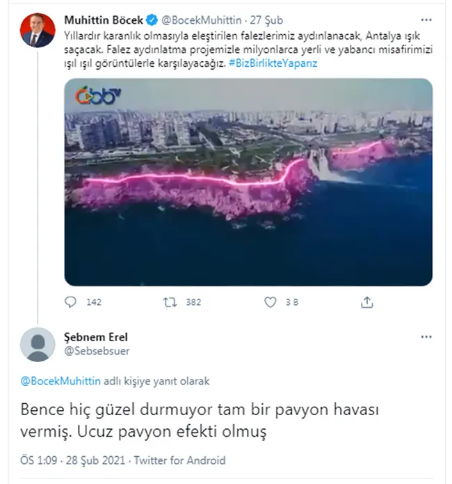 Başkan Böcek'in proje tanıtım videosunun altına yapılan yorumlarda ise çok sayıda 'pavyon gibi' benzetmesi yapıldı. Sosyal medyadaki tepkilerde ise yüzlerce kişi projeye karşı çıktı. Bazı yorumlar şöyle; 'Lütfen, böyle rengarenk, pavyon gibi, göz yorucu bir ışıklandırma olmasın', 'Güzel bir şey olur mu diye baktım ama bu gerçekten korkunç, yalvarırım böyle bir şey yapmayın', 'Falezlerde ve kıyı şeridinde yaşayan ve üreyen canlılara yazık etmeyiniz, lütfen onların da yaşamına saygı gösterin, siz uyurken ışıklarınız sabaha kadar açık kalıyor mu?', 'Bence hiç güzel durmuyor tam bir pavyon havası vermiş. Ucuz pavyon efekti olmuş', 'Anket yapın başkanım. Size oy vermiş biri olarak diyorum ki proje çok kötü görünüyor. Işıklandırma bu değil. Yapmayın karanlık kalsın bari. Pavyon, disko görüntüsü ucuzluk basitlik', 'Işıl ışıl her yer, her yer sanki pavyon', 'Güzelim falezleri pavyona çevireceksiniz, bırakın doğal güzelliği ile kalsın'.