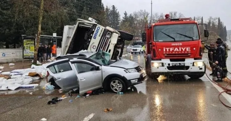 Kaza, sabah saatlerinde Hamza Taş Caddesi ile Süleyman Demirel Bulvarı'nın birleştiği eski Varsak Belediyesi'ndeki kavşakta meydana geldi. Kent merkezi istikametine seyir halinde iken Şahin Karataş'ın kullandığı gübre yüklü kamyon, yağmur nedeniyle kayganlaşan yolda, kontrolden çıkarak durakta yolcu bekleyen 07 AU 0336 plakalı halk otobüsüne çarptı. Kavşaktan caddeye savrulan kamyon, önünde ilerleyen Gülşen Saygılı yönetimindeki 07 MKB 45 plakalı otomobilin üzerine devrildi. Çevredekilerin ihbarı üzerine kaza yerine sağlık ve itfaiye sevk edildi.