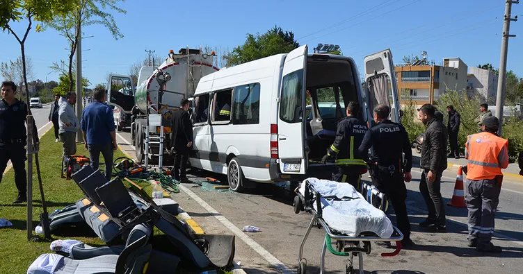 Antalya'nın Serik ilçesindeki kaza, saat 10.00 sıralarında, Dikmen Mahallesi'nde Belek Turizm Yolu'nda meydana geldi. Kemer ilçesinden Belek'teki eğlence merkezine giden turistlerin içinde olduğu, Mehmet Deniz'in kullandığı 07 C 1462 plakalı tur minibüsü, refüjde sulama yapan Büyükşehir Belediyesi'ne ait Ramazan Ozan idaresindeki 07 BMR 347 plakalı tankere arkadan çarptı. Şoför Deniz'in araçta sıkıştığı kazada, 1'i çocuk 5 İngiltere uyruklu turist yaralandı.