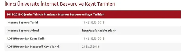 AÖF 2018-2019 ikinci üniversite başvuru tarihi 11 Eylül ile 21 Eylül tarihleri arasında olup internet üzerinden gerçekleştirilecek. Adaylar yine aynı şekilde 11 Eylül ile 21 Eylül tarihleri arasında yakınlarında bulunan AÖF bürolarna gidip kayıt işlemlerini gerçekleştirebilir.