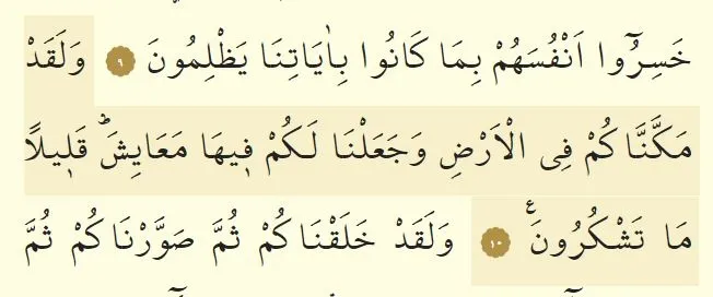 Ve lekad mekkennâkum fîl ardı ve cealnâ lekum fîhâ maâyiş' (maâyişe), kalîlen mâ teşkurûn(teşkurûne).