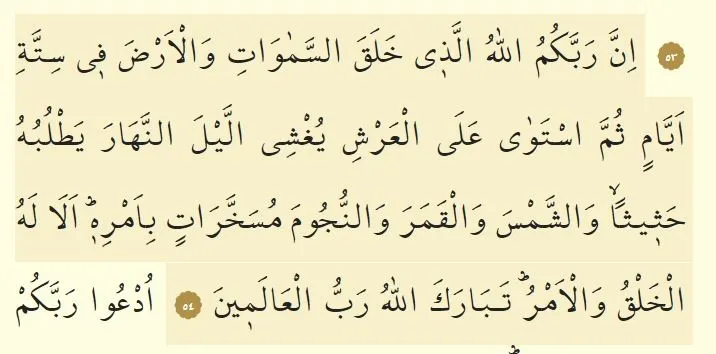 "Şüphesiz sizin Rabbiniz, gökleri ve yeri altı gün içinde (altı evrede) yaratan ve Arş'a kurulan, geceyi, kendisini durmadan takip eden gündüze katan, güneşi, ayı ve bütün yıldızları da buyruğuna tabi olarak yaratan Allah'tır. Dikkat edin, yaratmak da, emretmek de yalnız O'na mahsustur. Âlemlerin Rabbi olan Allah'ın şanı yücedir."