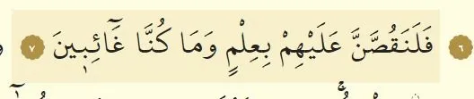 Araf Suresi 7. ayet olan bitenlerden Allah'ın habersiz olmadığı, tersine her yerde hazır ve nazır durumda olduğu için her yapılan hakkında gizlisi ve açığı ile bilgi sahibi olduğu vurgulanır. Aynı zamanda elçilere ve ümmetlere tüm çaba ve amaçlarını, bilgi ve belgelerle haber vererek anlatılacağı kendilerinin gaipler gibi uzakta habersiz olmadıkları üzerinde durur.