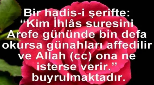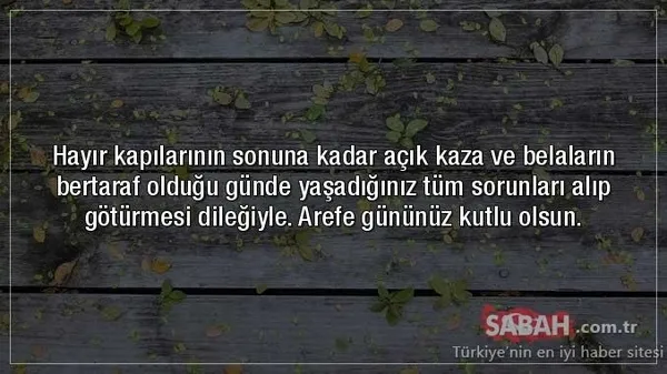 Hayır kapılarının sonuna kadar açık, kaza ve belaların bertaraf olduğu günde yaşadığınız tüm sorunları alıp götürmesi dileğiyle. Arefe gününüz kutlu olsun.