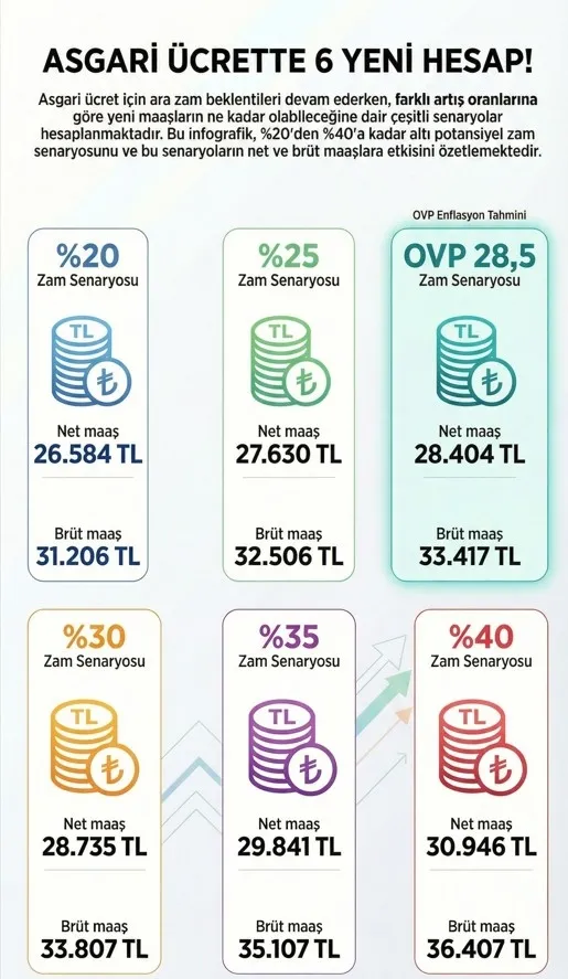 Yüzde 30'luk bir zam senaryosunda, 2026 yılı net asgari ücretin 28.735 TL, brüt ücretin ise 33.807 TL olması bekleniyor.