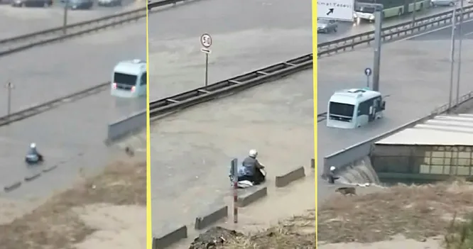Aşırı yağışa aldırmadı, motosikletini sele kaptırdı