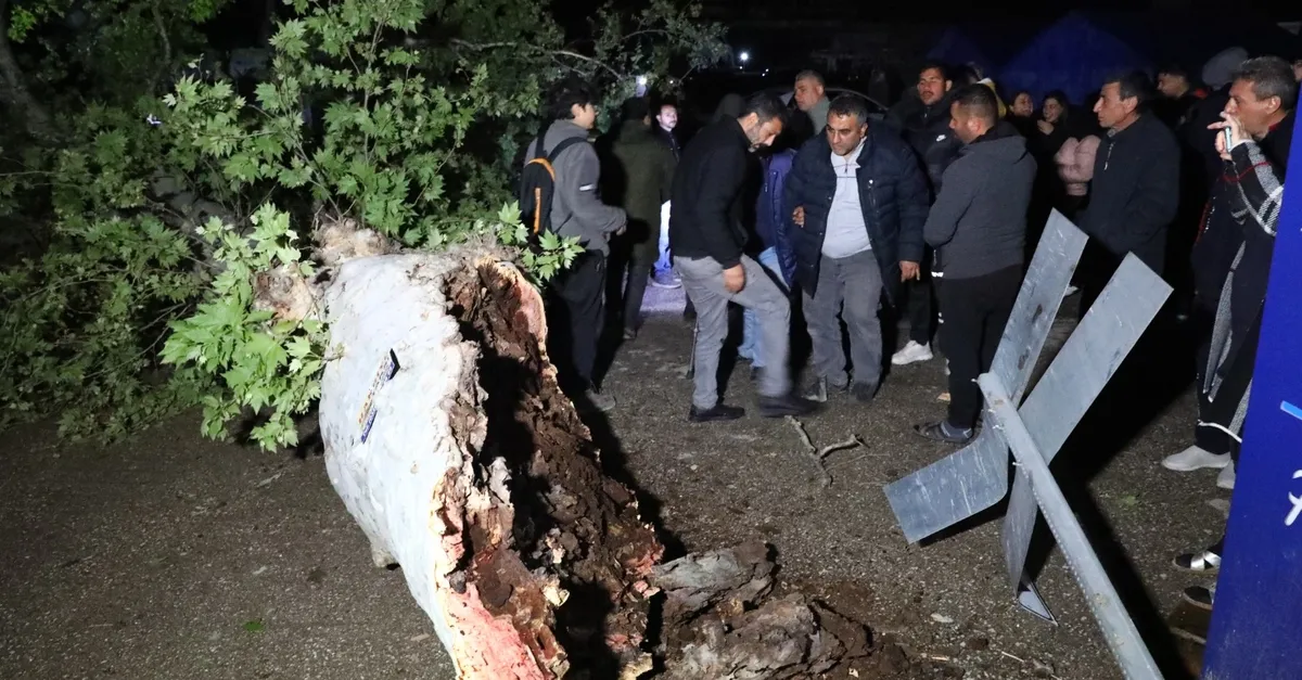 Olay, saat 22.00 sıralarında Antakya ilçesine bağlı Bağrıyanık Mahallesi'nde meydana geldi. Kentte sabahın ilk saatlerinden itibaren etkili olan şiddetli yağış hayatı olumsuz etkilerken mahalle meydanında bulunan yüzyıllık çınar ağacı fırtına dayanamayarak devrildi. Çınar ağacı, elektrik direklerine bağlı telleri de koparması sonucu mahallede elektrik kesintisi yaşandı. Çevrede bulunan depremzedelerin ihbarı üzerine bölgeye gelen polis çevrede güvenlik önlemi alırken itfaiye ekipleri ağacın gövdesini kaldırmak için çalışma başlattı.