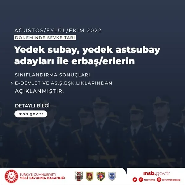 MSB ASAL ile Askerlik yerleri bugün (29 Temmuz 2022) belli oldu. Ağustos celbi askerlik yerleri e-Devlet üzerinden öğrenilecek olup Yedek subay/astsubay adayları ile erbaş/erlerin sevk tarihleri açıklandı.