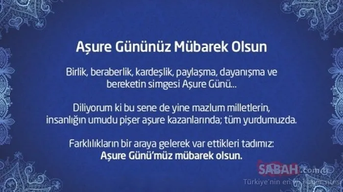 Aşure gününüz mübarek olsun. Tuttuğunuz oruçlar ve dualarınız makbul ve kabul olsun.