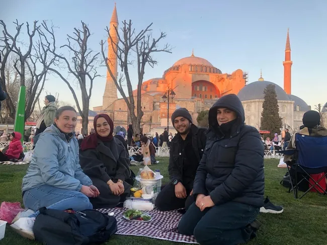 Rabia Hanım aslen Konyalı. İstanbul'da yaşıyor. O, Filistinli ailenin Ayasofya Camii'ni görmek istediklerinden bahsediyor ilk. Ziyaret sonrası için ise 'Sultanahmet Meydanı'nda iftarı da yaparız' deyip geldiklerinden söz ediyor. Rabia Hanım, "Misafirlerimiz Filistin'den... İlk defa Ramazanı İstanbul'da yaşıyorlar. Onlar Ayasofya'yı görmek istediler. Biz de buraya getirdik. Atmosfer çok güzel. İnsanlar çok mutlu... Sofrayı hazırladıktan sonra Arjantinli misafirler geldi. Tanımıyoruz ama fotoğraf çekmek istediler. Biz onları da sofraya davet edip yemek ikram ettik. Uluslararası bir iftarla karşı karşıyayız. Sofradaki yemekler ise Filistinlilere ait etli pilav yemeği... Filistinliler yaptı yemeği... Size de ikram edeceğiz. Burada iftar açmak çok güzel. Uluslararası bir iftarla karşı karşıyayız. Burada iftar başka." diyor. Sofrada bulunan Fatma Akyol ise İlahiyat öğrencisi, Arapça biliyor. Hemen söz alıyor: "Buranın manevi atmosferi çok güzel. Misafirlerimizle birlikte Ayasofya'yı ziyaret edebilmek ve namaz kılabilmek çok güzel. Filistinlilerle beraber olmaktan çok memnunum."