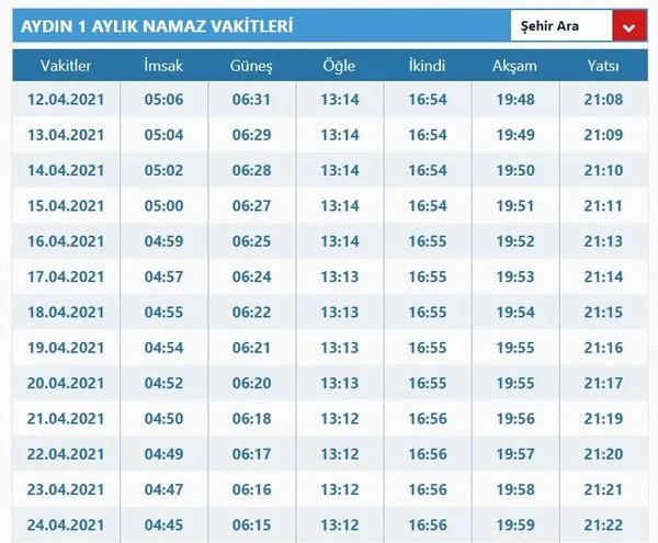 AYDIN İMSAKİYE İLE İFTAR VAKTİ VE SAHUR SAATLERİ 2021