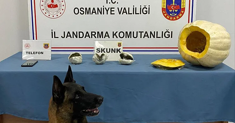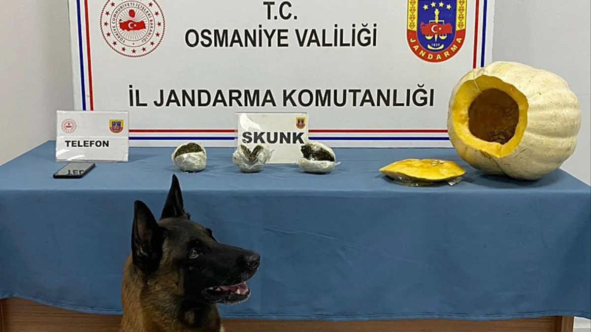 İl Jandarma Komutanlığı ekipleri, Bahçe ilçesinde otoyolda yaptıkları uygulamada bir yolcu otobüsünü durdurdu. Narkotik dedektör köpeği yardımıyla aracın bagajında arama yapan ekipler, yolculardan H.P.'nin (19) bıraktığı bal kabağının içinde 706 gram skunk buldu. Gözaltına alınan şüpheli işlemlerinin ardından sevk edildi ve tutuklandı.