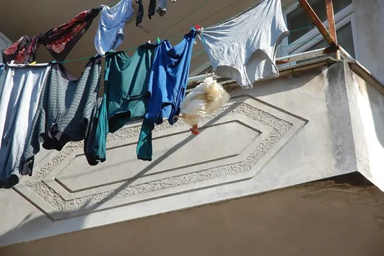 Apartmanın 1'inci katındaki dairenin balkonunda, çamaşır ipine baş aşağı bacağından asılı halde duran tavuğu görenler durumu itfaiyeye bildirdi.