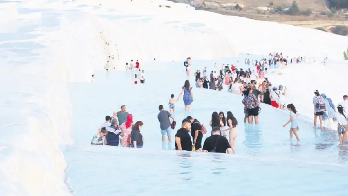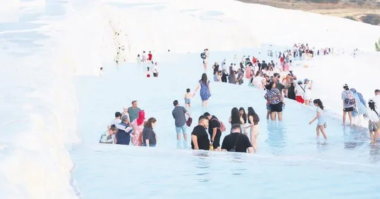 UNESCO Dünya Mirası Listesi'nde yer alan Pamukkale, bayramda 32 bin 249 turisti ağırladı. Travertenleri, şifalı termal suyu, çevresindeki antik kentlerle dört mevsim turist çeken Pamukkale'nin giriş kapılarında ziyaretçi yoğunluğu nedeniyle zaman zaman kuyruk oluştu. Bölgeyi görmeye gelen misafirler, beyaz travertenlerde yürüyüp su dolu havuzlarda serinlemeye çalıştı.