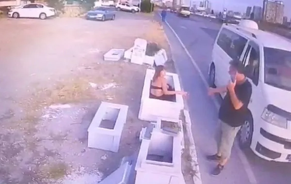 Büyükçekmece'de bir kadın mezar taşı yapan bir işletmenin teşhir amaçlı yol kenarına bıraktığı boş mezarın içine girdi. Yaşanan anlar güvenlik kamerası tarafından kaydedildi.