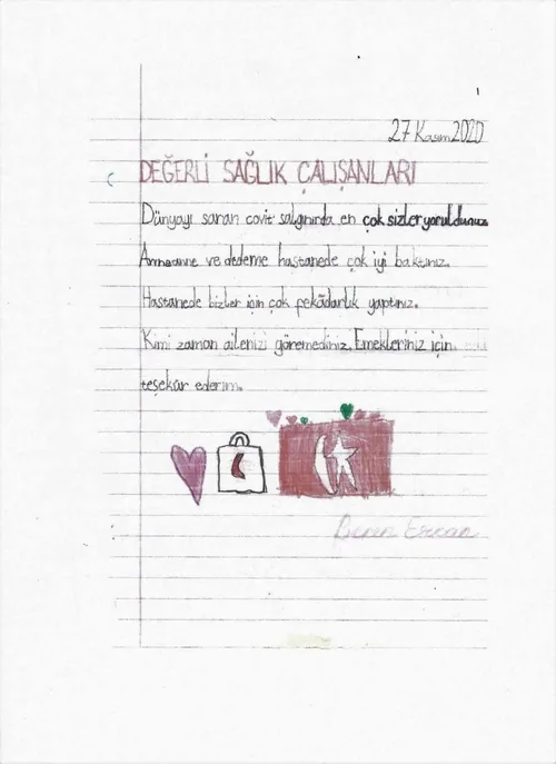 Okulda verilen ödev olarak COVID-19 testi pozitif çıkan anneannesi ve dedesinin tedavisinin gerçekleştirildiği SANKO Üniversitesi Hastanesi doktorlarına mektup yazan Ercan, "Değerli Sağlık Çalışanları, dünyayı saran COVID-19 salgınında en çok sizler yoruldunuz. Anneanneme ve dedeme hastanede çok iyi baktınız" ifadelerine yer verdi. "Hastanede bizler için çok fedakârlık yaptınız. Kimi zaman ailenizi görmediniz, emekleriniz için teşekkür ederim" diye yazan Ercan, mektubuna kalp, sağlık çantası ve Türk Bayrağı çizimi de yaptı.