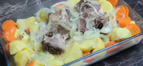 Üzerine et ve patatesleri, en üste de soğanları yerleştiriniz.