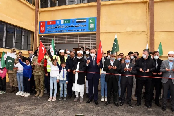 Suriye'nin Rakka ilçesi Rasulayn'da, Pakistan merkezli Selam Evi Yardım Derneği tarafından bakım ve onarımı tamamlanan, bünyesinde 6 derslikli anasınıfı da bulunan toplam 32 derslik ve bin öğrenci kapasiteli Salim El Mari İlkokulu, Şanlıurfa Valisi Abdullah Erin, Selam Evi Yardım Derneği yöneticileri tarafından törenle açıldı.