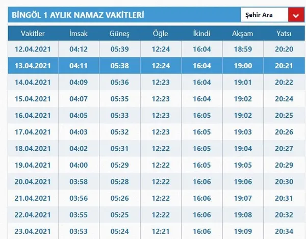 BİNGÖL İMSAKİYE İLE İFTAR VAKTİ VE SAHUR SAATLERİ 2021