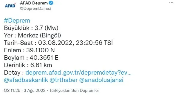 Afet ve Acil Durum Yönetimi Başkanlığının (AFAD) sosyal medya hesabından yapılan açıklamada, saat 23:20'de merkez üssü Bingöl olan 3,7 büyüklüğünde sarsıntı kaydedildi. Sarsıntı, bölge halkında tedirginliğe neden olurken "Deprem mi oldu, nerede, kaç büyüklüğünde?" sorularıyla depremin detayları araştırılıyor. İşte AFAD verilerine göre Bingöl deprem haberinin ayrıntıları...